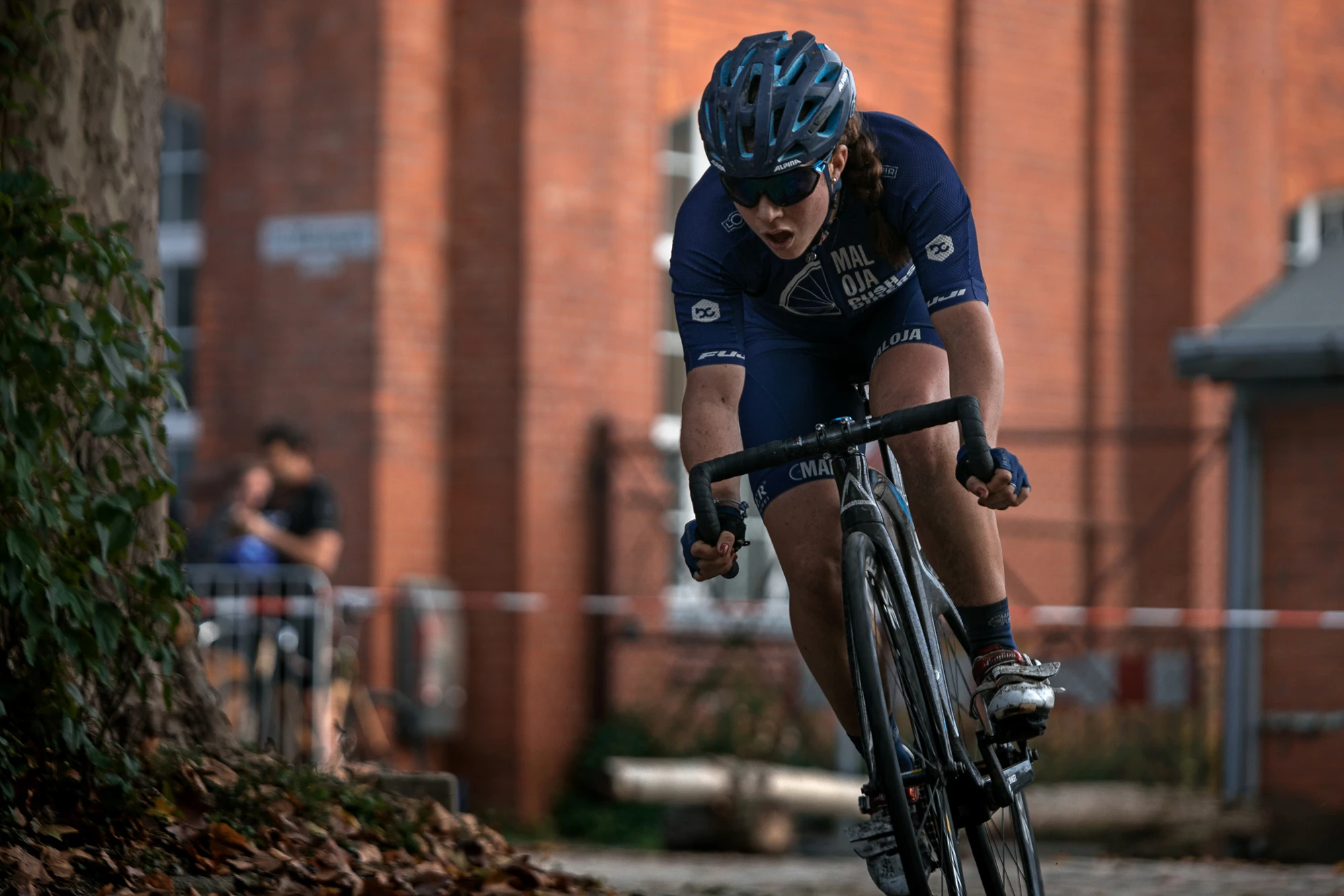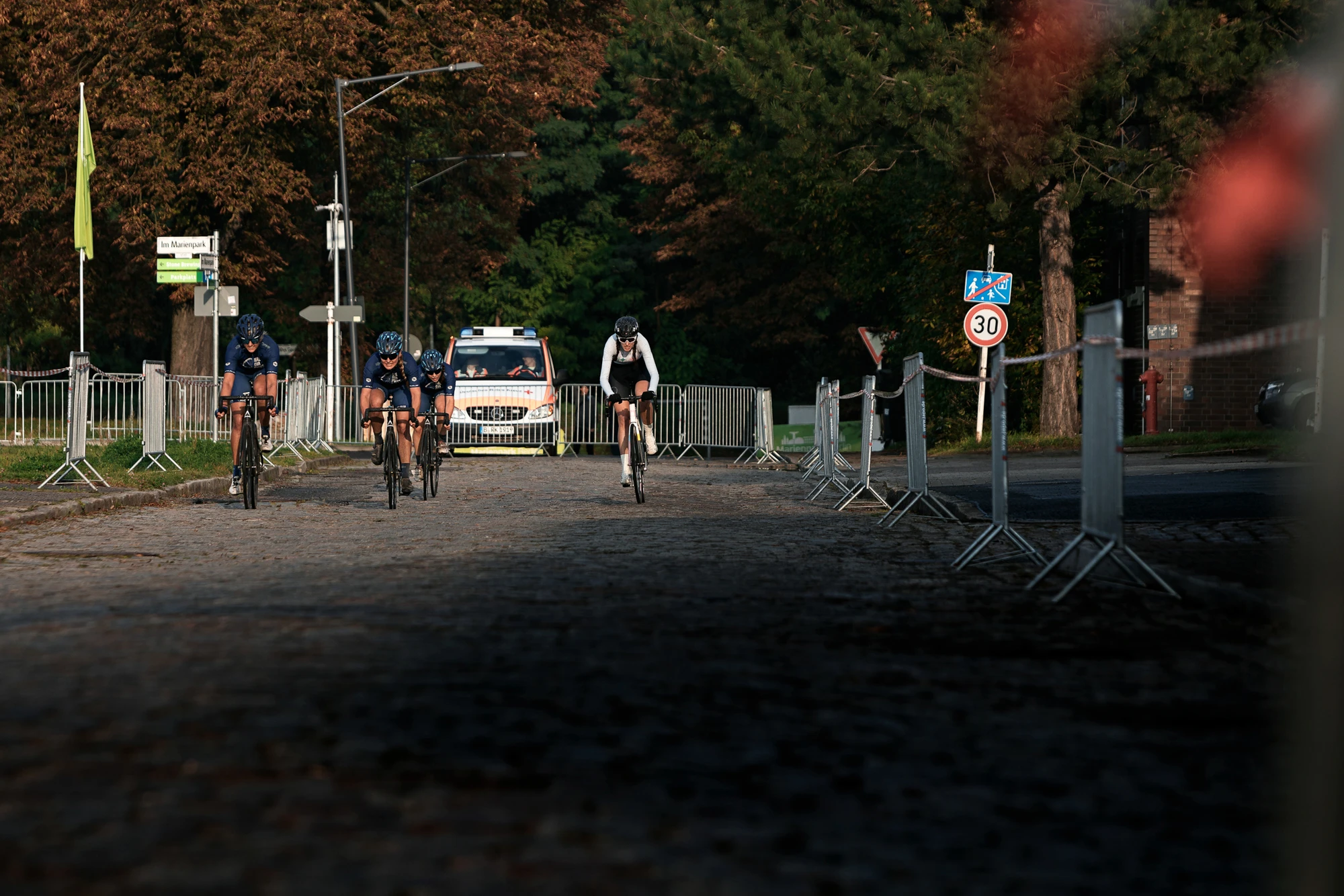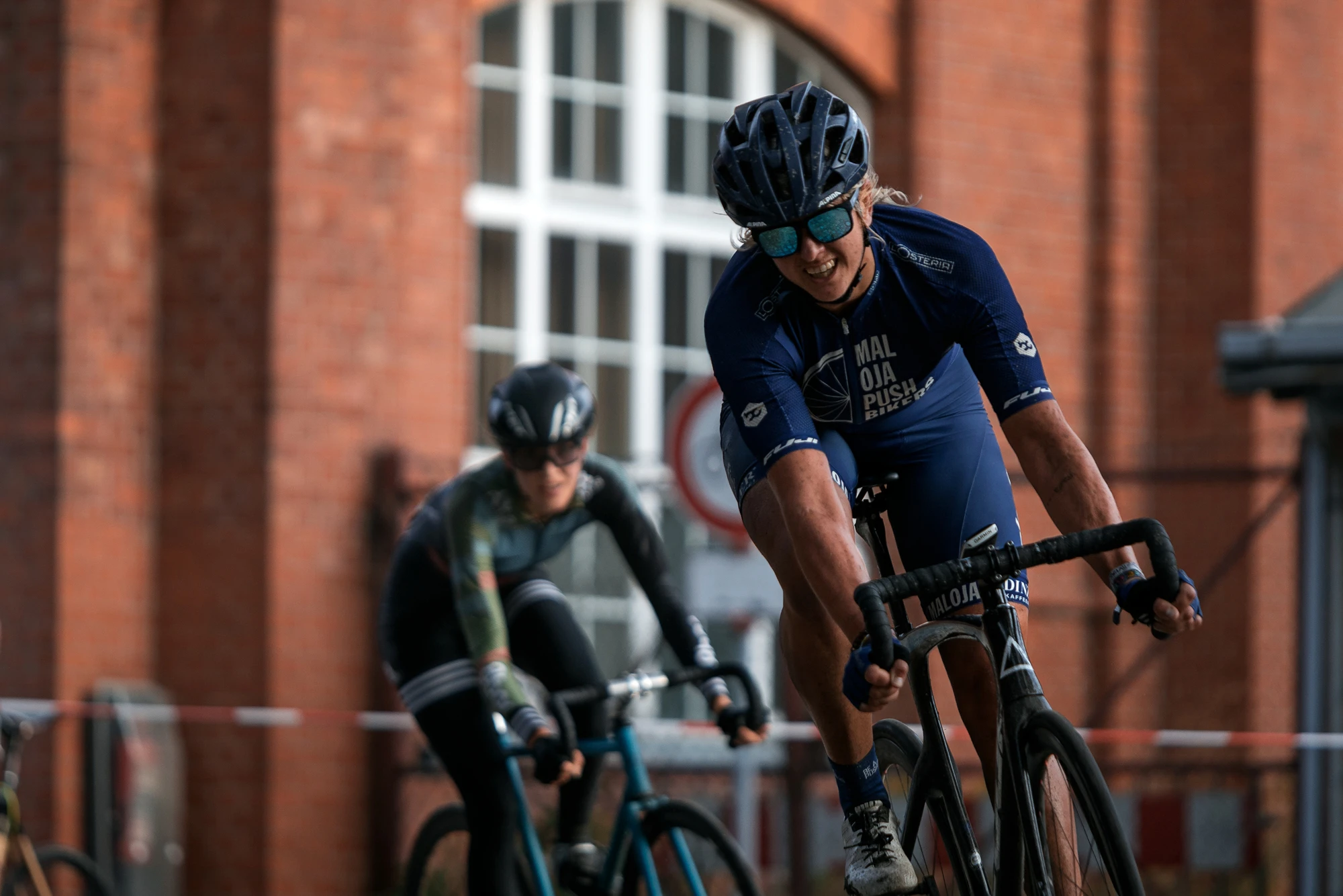The lap with it’s partly dry and partly wet turns and cobbles was not getting any easier to ride for the ladies. After the start it was soon clear what was going on. Three Maloja Pushbikers and Sami Sauri went clear and made it their race. Sami Sauri might have been outnumbered but still was going for the first couple of sprints against the three Pushbiker teammates. Reacting on that they tried to box in Sami and then attack.